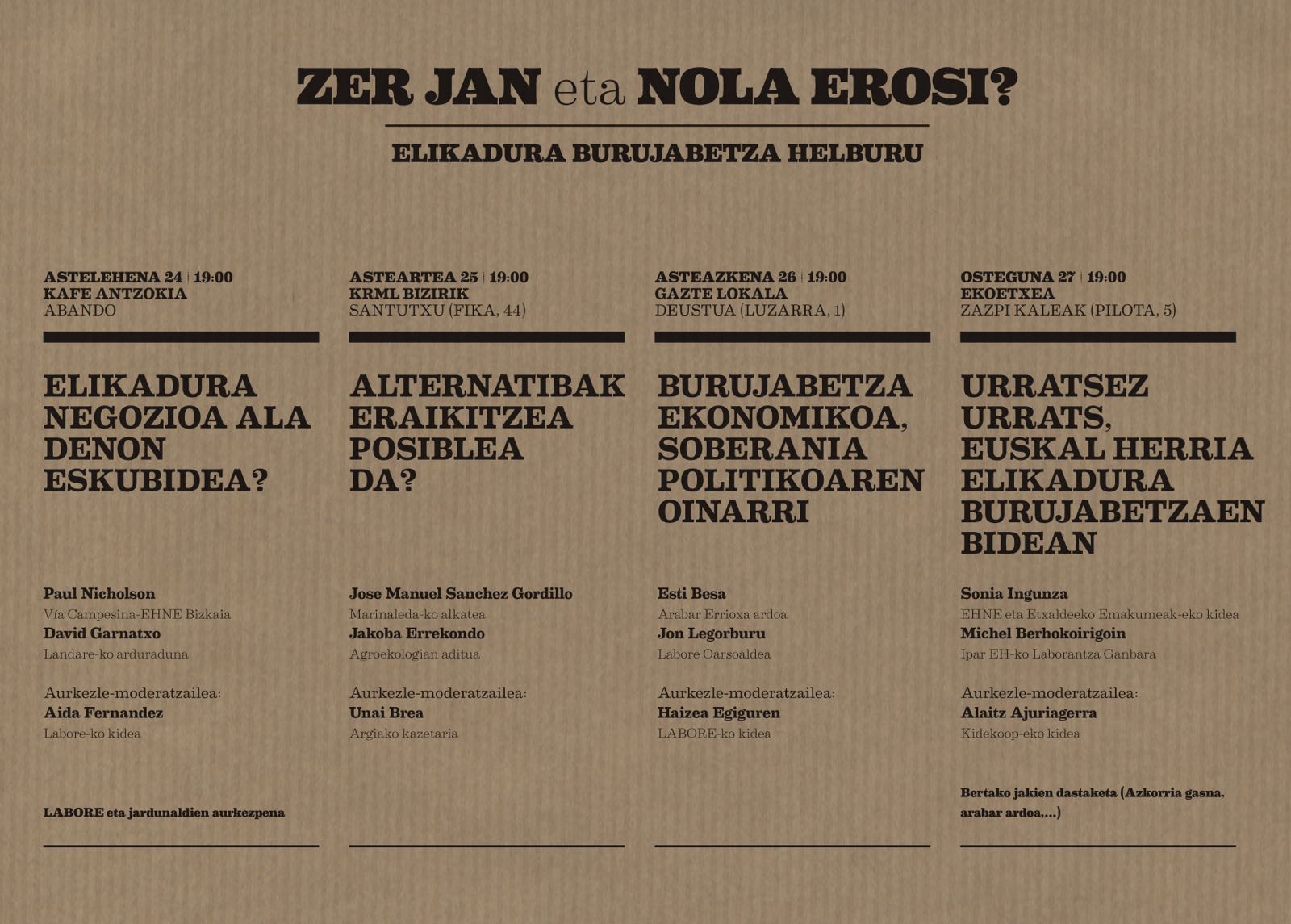 Egungo testuinguruan, elikadura burujabetza Euskal Herrian, eta Bilbon zehatzago, gogoetarako marko bat eskaintzea dugu xede: gaurko nekazaritza industriala jasangarria da? Iraungarria da? Elikadura negozio bihurtzeak nora garamatza? Alternatibarik badago? Teorian sakontzeko, eta baita praktikaren bitartez erantzun posibleak atera nahiko genituzke, aurkezturiko mahai-inguru hauekin.